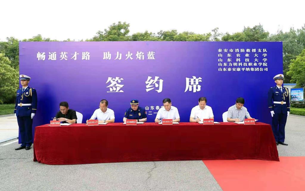 签约仪式上,王靖磊代表驻泰高校表态讲话。他说,泰安市消防救援支队和康平纳集团立足单位未来发展战略,为提升单位人员的业务水平及专业技能,充分借助驻泰高校的人才和专业优势,实现高等院校与用人单位之间的资源整合,开启了泰安市消防救援支队、康平纳集团和高校合作的崭新篇章。高校将充分发挥人才优势、学科优势和科研优势,竭诚为泰安消防救援支队、康平纳集团的可持续高质量发展提供智力支持,泰安消防救援支队、康平纳集团也必将为高校人才培养和成果转化提供平台。希望通过各方共同努力,真正将消防救援人才培养工作做实、做优,为打造泰安消防教育品牌、培养消防专业人才、推动全市消防救援队伍全面转型升级,提供坚实的基础和保障;真正契合高科技企业人才需求,推动科技成果产业转化与推广,在推动节能减排转型升级、实现新旧动能转换方面发挥高校的服务经济社会发展能力。
