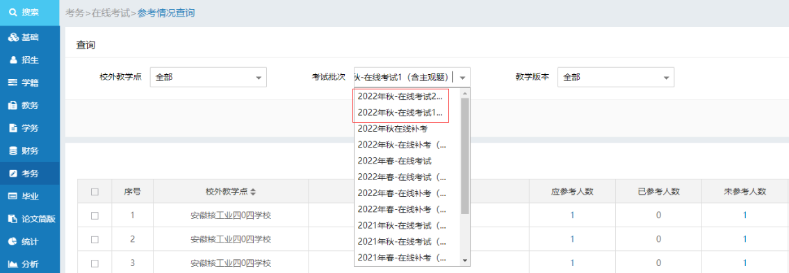 考试批次选择“2022年秋-在线考试1(含主观题)”和“2022年秋-在线考试2(全客观题)”,点击查询,再点击人数便可查看本站(点)应考、已考、未考学生。对未考学生应及时督促,保证在规定时间内全部参考。