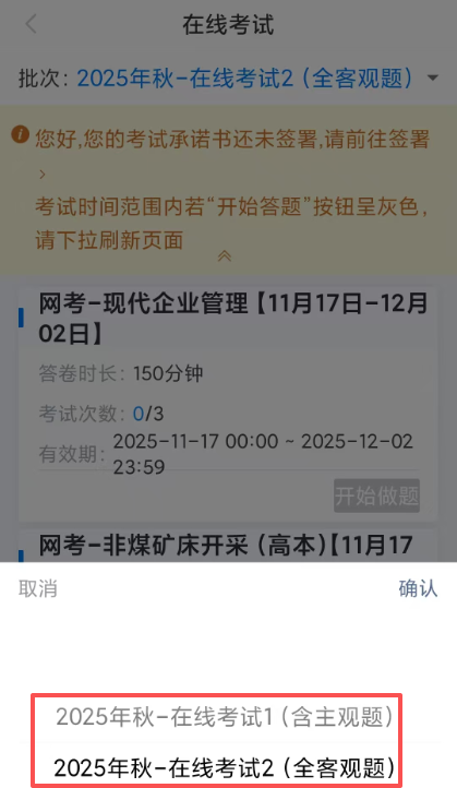 在移动APP首页上,点击“在线考试”,进入在线考试页面:在该页面点击批次,在批次下拉列表中会显示“2025年秋-在线考试1(含主观题)”和“2025年秋-在线考试2(全客观题)”,核实各批次下考试科目后,点击开始答题,即可参加线上考试。